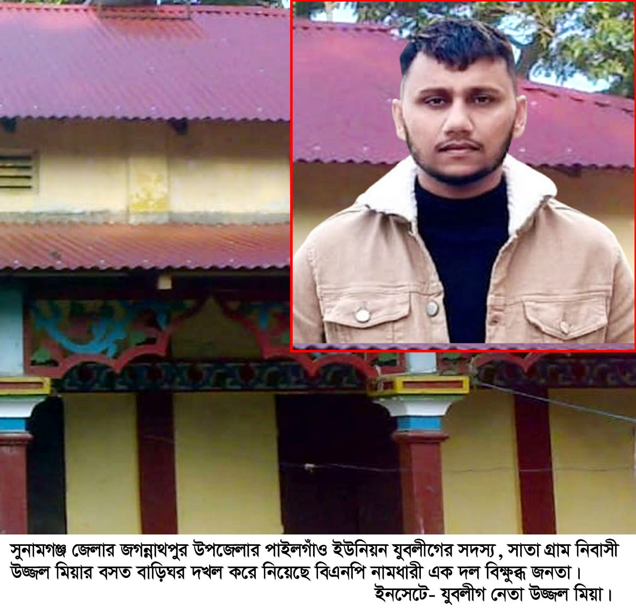 স্টাফ রিপোর্টার : সুনামগঞ্জ জেলার জগন্নাথপুর উপজেলার পাইলগাঁও ইউনিয়ন যুবলীগের সদস্য উজ্জল মিয়াকে খোঁজতে গিয়ে তার বসত বাড়ি দখল করে নিয়েছে বিএনপি নামধারী এক দল বিক্ষুব্ধ জনতা।