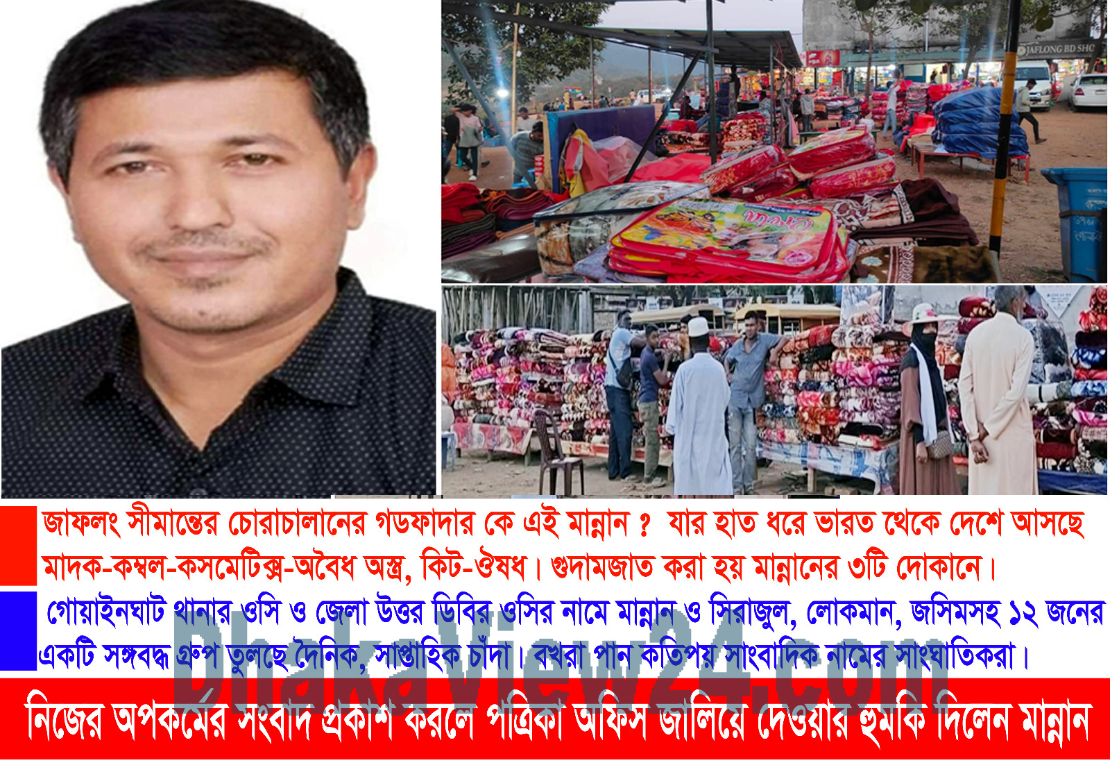 গোয়াইনঘাটের জাফলং সীমান্ত দিয়ে দীর্ঘদিন থেকে ভারত থেকে আসছে অবৈধ মাদক, বিভিন্ন রকম অস্ত্র, কসমেটিকস, কম্বল, জিরা, কিট, চিনি, মটর সাইকেলসহ নানা রকম অবৈধ পণ্য। মাঝে মধ্যে লোক দেখানো অভিযান ছাড়া দৃশ্যমান কিছুই করতে পারেনা প্রশাসন। যদিও এসব চোরাচালান বন্ধ করতে সিলেট বিভাগীয় কমিশনার ও রেঞ্জ ডিআইজি বারবার দিচ্ছেন কঠোর নির্দেশনা।সিলেটের নবাগত পুলিশ সুপার চোরাচালান বন্ধে সাংবাদিকদের শুনিয়েছেন আশারবাণী। স্থানীয়রা বলছেন, গোয়াইনঘাট থানায় নবাগত ওসি কোন কিছু বুঝে উঠার আগেই তার নামে শুরু হয়েছে চাঁদাবাজী। নবাগত এসপির নামে বাড়িয়ে দেওয়া হয়েছে বখরার টাকার পরিমান। অথচ এসপি চোরাচালান বন্ধে বদ্ধপরিকর বলে দিয়েছেন হুশিয়ারী। এতো কিছুর পর কোন ভাবেই থামানো যাচ্ছেনা সীমান্তের চোরাচালান। বিভাগীয় চোরাচালান প্রতিরোধে টান্সফোর্সের সভায় বার-বার উঠে আসছে জাফলং সীমান্তের চোরাচালানের বিষয়টি। পুলিশের খাতায় সীমান্তের চোরাকারবারিদের গডফাদার এখন মান্নান মেম্বার। যিনি অপ্রতিরোধ্য এক চোরাচালানের লাইনম্যান। মান্নান এবার চোরাকারবারিদের বলছেন, বর্তমান ওসির কাছ থেকে লাইন নিতে তার ২০ লাখ টাকা খরচ হয়েছে। কারণ সেই টাকা উপর মহলে দিতে হচ্ছে। তাই আগের পরিমান টাকা দিলে হবে। এবার চোরাচালানের পন্য আনতে হলে লাইনের জন্য বেশী টাকা দিতে হবে। খোঁজ নিয়ে জানা যায়, জাফলং জিরোপয়েন্ট বিজিবির ক্যাম্পের পাশেই প্রতিদিন মান্নান মেম্বারের নেতৃত্বে বসছে ভারতীয় চোরাচালান পণ্য বিক্রির হাট। যেটি এখন ভারতীয় কম্বলের হাট হিসাবে পরিচিত। এই হাট থেকে মান্নান মেম্বার গোয়াইনঘাট থানার ওসি জেলা উত্তর ডিবির ওসি নামে লাখ টাকা বখরা তুলছেন বলে সরেজমিন ব্যবসায়ীরা জানান। তাদের ভাষায়, মান্নান ম্যানেজ মানে পুলিশ ডিবি-বিজিবি ম্যানেজ। সম্প্রতি এসব চোরাইহাটের সংবাদ প্রকাশ হলে গত ২১ ডিসেম্বর রবিবার সকালে অভিযান চালায় স্থানীয় বিজিবি। অথচ বিজির ক্যাম্প ঘিরেই মান্নান মেম্বারে চোরাইপন্যর তিনটি দোকান। সেই অভিযানের আগের রাতেই খবর পৌঁছে যায় চোরাকারবারিদের কাছে। ফলে চোরাকারবারিরা সে দিন আগেই সরিয়ে ফেলে তাদের চোরাচালানের মালামাল। ফলে বিফল হয় বিজিবির লোক দেখানো অভিযানটি। অথ বিজিবি ক্যাম্পের পাশেই মান্নান মেম্বারের ভাইদের ৩ টি ভারতীয় চোরাই মালের দোকান ও গোডাউন। সেটি চুখে দেখেনা বিজিবি-ডিবি- কিংবা থানার পুলিশ। এমনকি টান্সফোর্সের সদস্যদের চোখে পড়েনা এসব চোরাইহাট। স্থানীয়দের প্রশ্ন সীমান্তের চোরচালানের গডফাদার কে থামাবে কে? সম্প্রতি অনুসন্ধানকালে দেখা যায়, গোয়াইনঘাট উপজেলার জাফলং লালমাটি পর্যটন কেন্দ্রের একটি দোকানে মধ্যরাতে ভারত-বাংলাদেশ সীমান্ত পেরিয়ে কম্ব